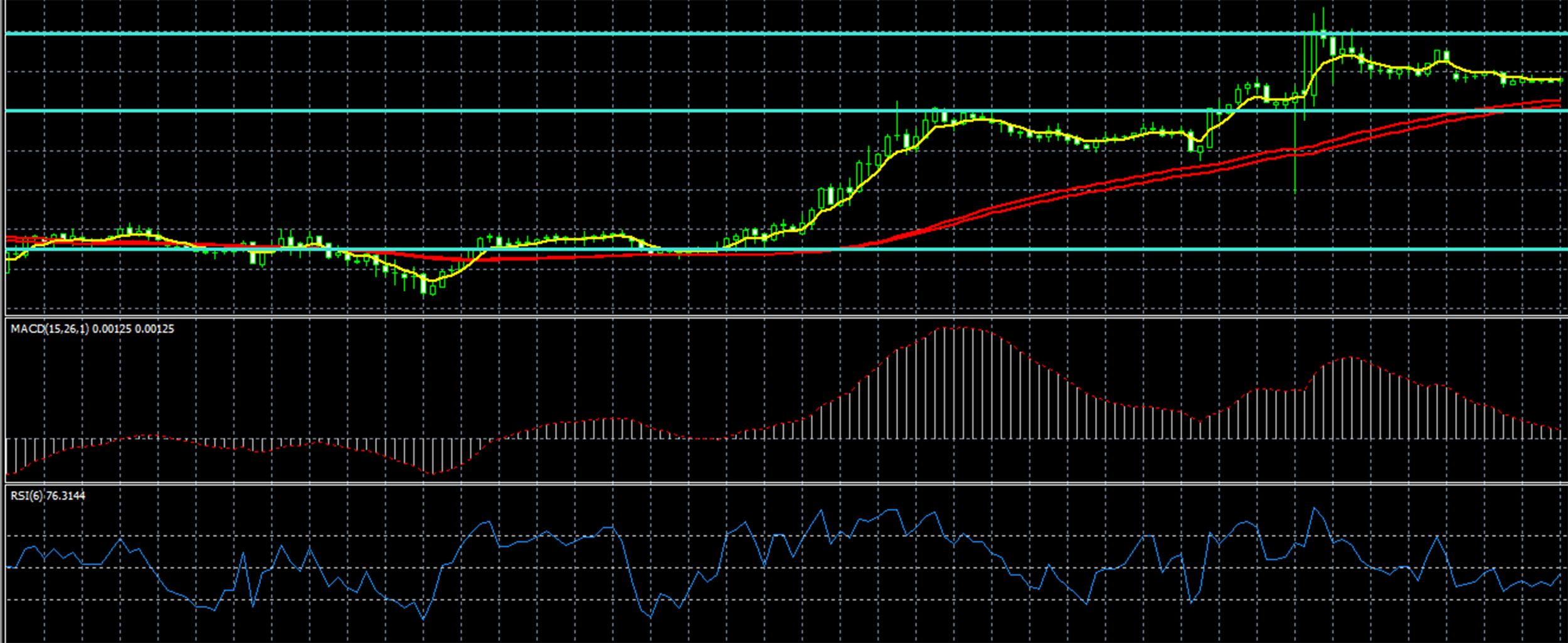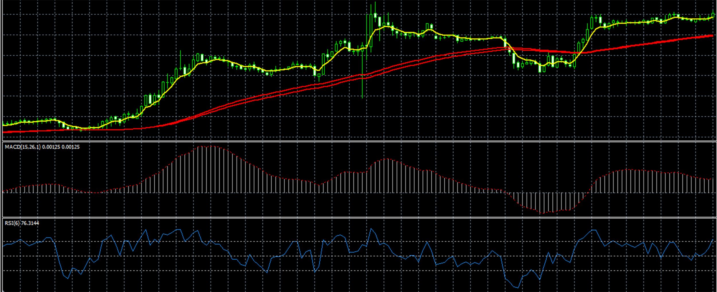 - Satu atau tiga indikator digambarkan langsung pada grafik, menunjukkan arah tren dominan. Ini bisa berupa moving averages, Bollinger Bands, Parabolic, Alligator, dll. Pilihan tergantung pada preferensi individual trader.
