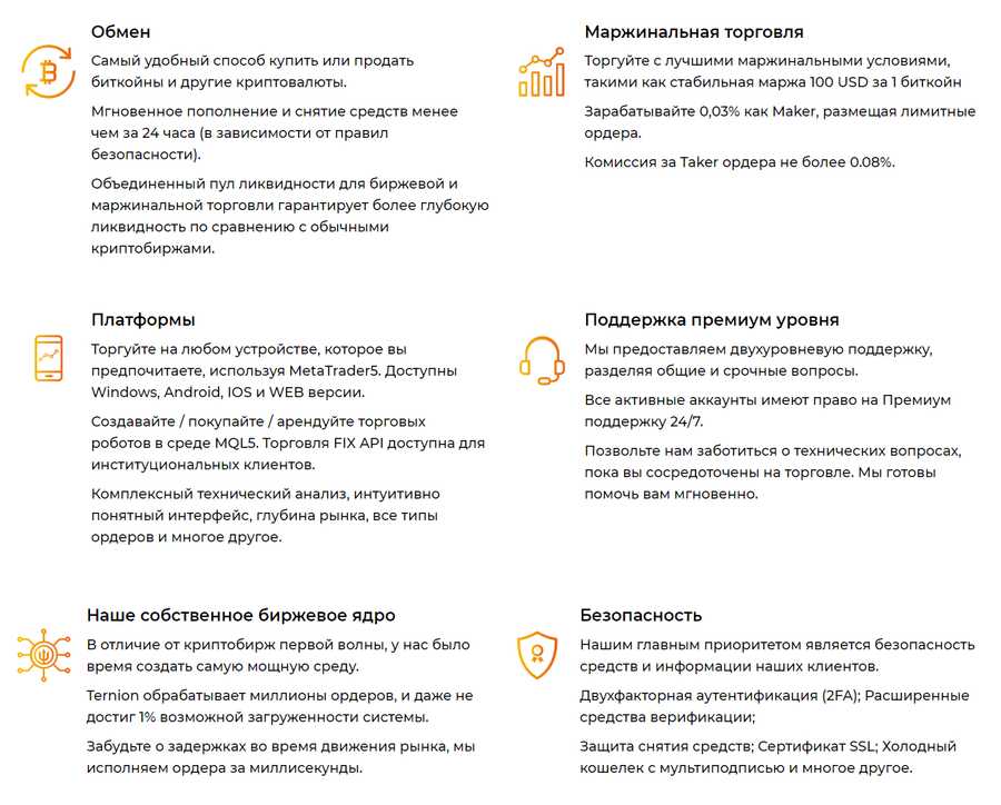 Pertukaran mata uang kripto Ternion berfokus pada menciptakan kondisi terbaik untuk perdagangan margin dan pertukaran. Pengguna dapat menukar mata uang kripto semudah mereka berspekulasi, secara signifikan meningkatkan likuiditas pertukaran hanya dalam satu akun. Komisi rendah, pembiayaan yang menguntungkan untuk perdagangan margin, kecepatan eksekusi order yang tinggi tanpa tersendat-sendat, dukungan fiat – semua ini berdampak positif pada hasil perdagangan.